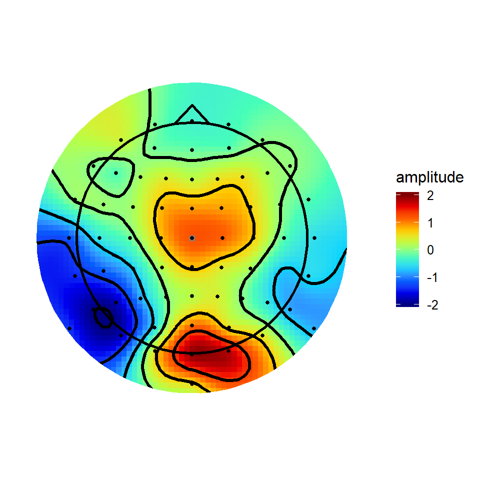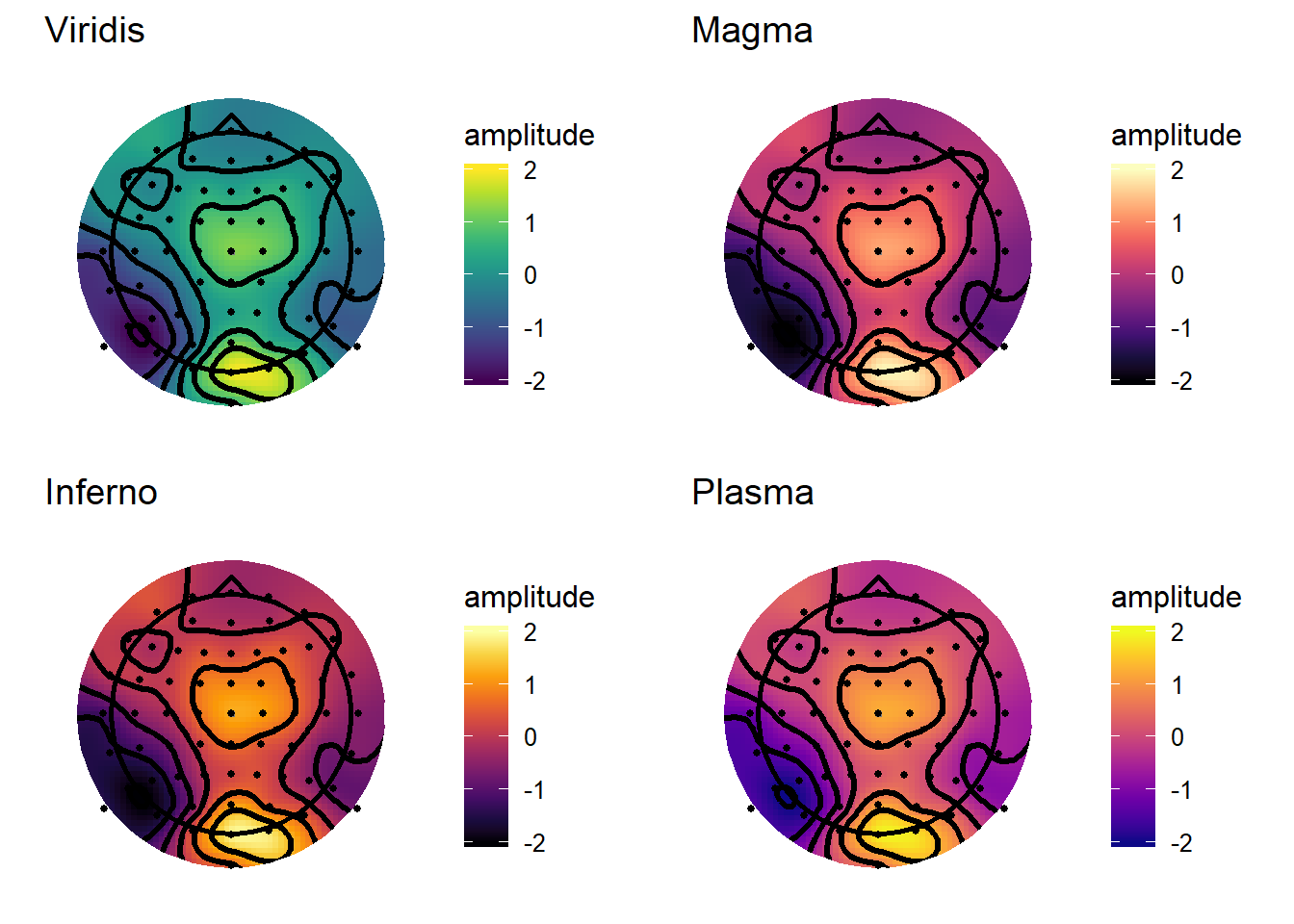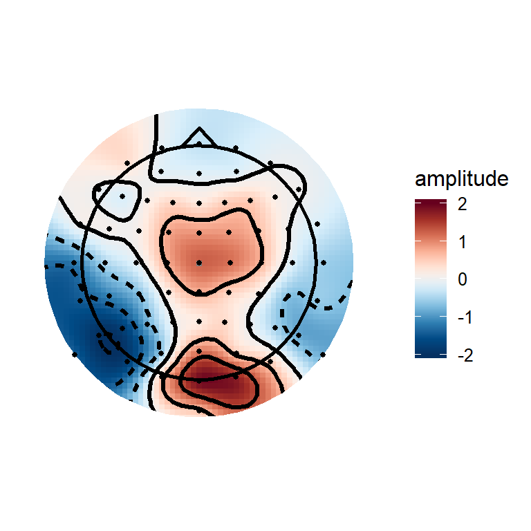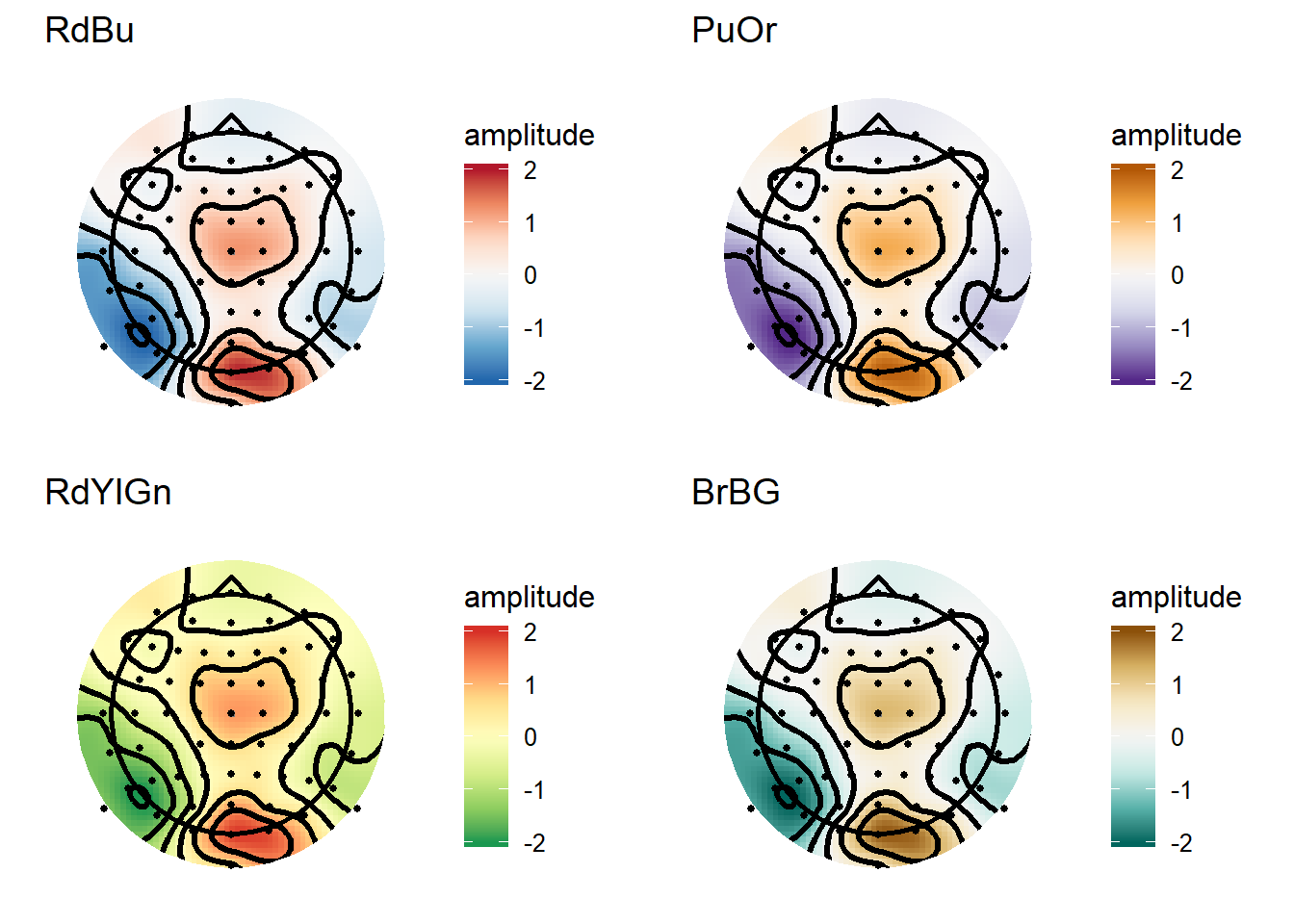MNE is a really comprehensive package for Python that offers many advanced tools for M/EEG analysis. Their default colourmap is the RdBu diverging map shown above. A neat trick I like on their topographies is that the contour lines change with the amplitude within each contour level; specifically, contours around amplitudes greater than or equal to zero use solid lines, while contours around amplitudes less than zero use dashed lines. That’s also simple to do in ggplot2. Note that here I also define a custom version of the “RdBu” colormap to make it a bit more punchy, like the MNE plots.