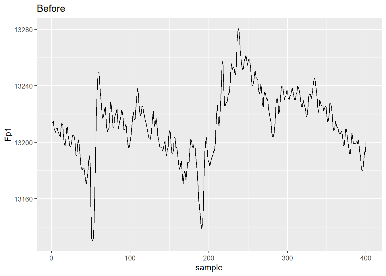 ggplot(aes(x = sample, y = Fp1)) + geom_line() + ggtitle("Before")