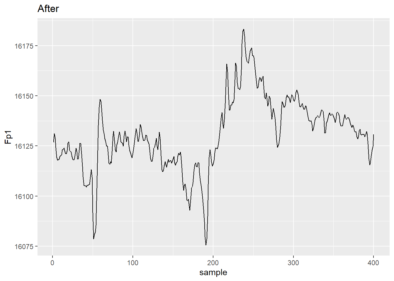 ggplot(aes(x = sample, y = Fp1))+ geom_line() + ggtitle("After")