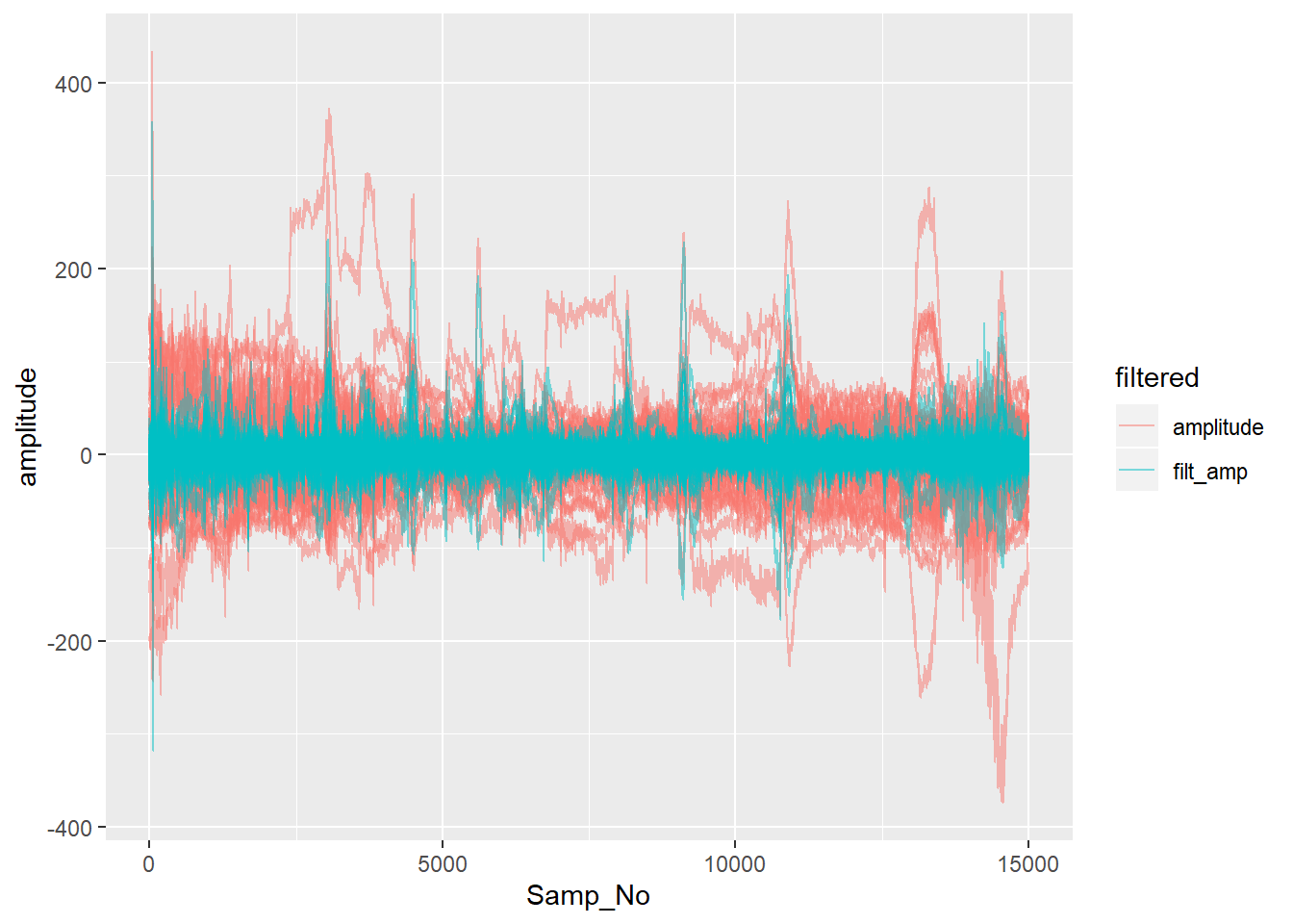 ggplot(aes(x = Samp_No, y = amplitude, group = interaction(electrode,filtered), colour = filtered)) + geom_line(alpha = 0.5)