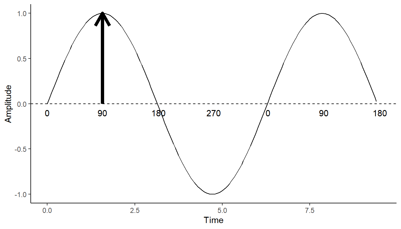 The amplitude of the wave is the distance between 0 and the wave at a given timepoint. So here, you can see it has a maximum of 1, indicated by the arrow. A complete cycle of of the wave is the amplitude peaking, declining to a trough, then hitting zero again. So the wave cycles from 0 up to 1, down to -1, then back up to 0.
