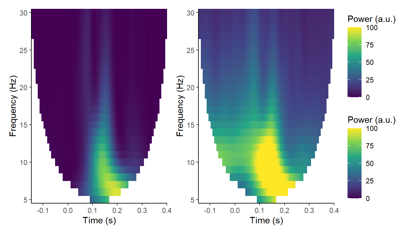 Thus, one interpretation of ITC is that it is capturing what we’d call evoked power - the power of the ERP - (left panel below) as opposed to induced or total power (right panel below). It is teasing out the phase-locked as opposed to non-phase-locked activity.