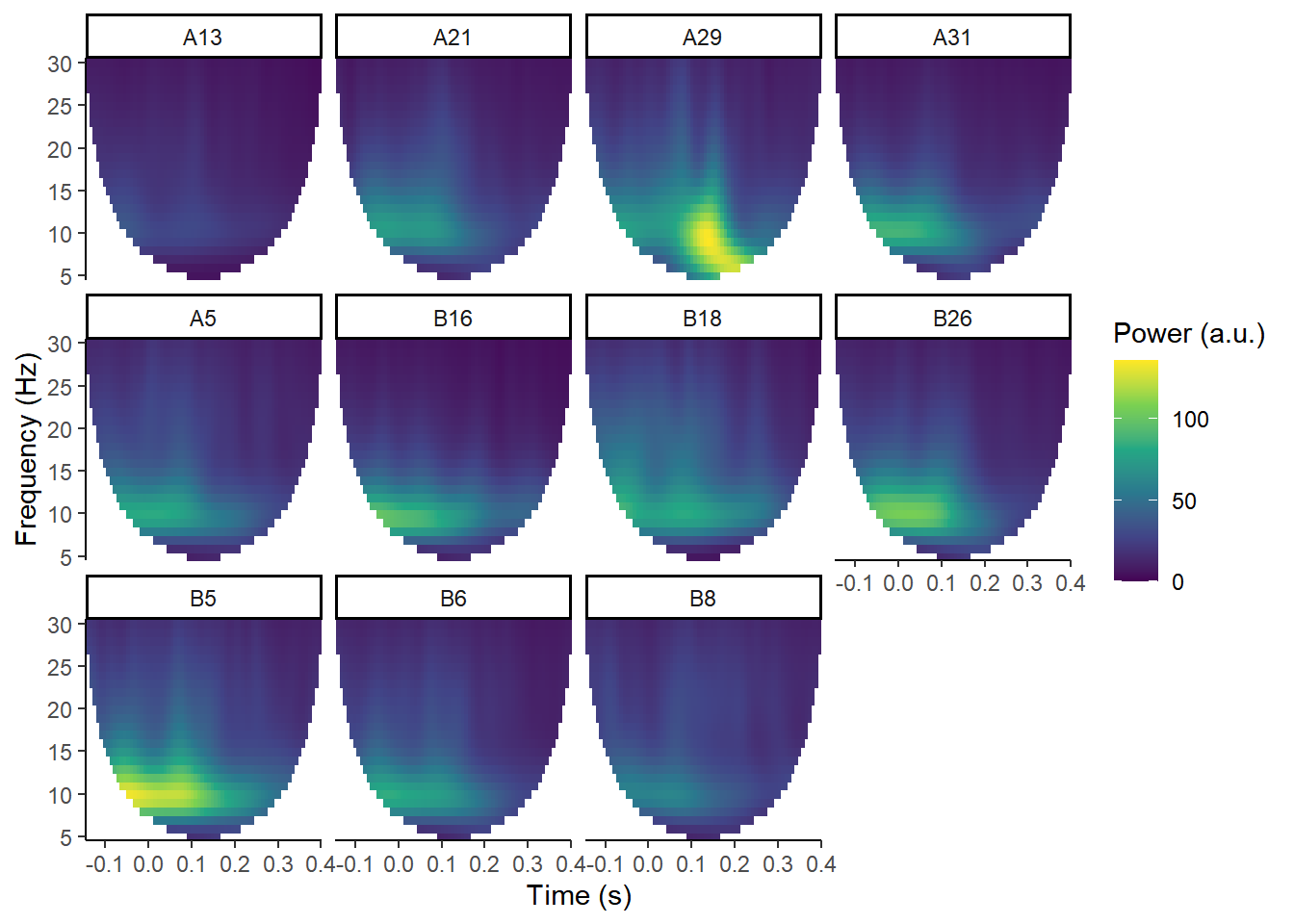 Ignore all the white at the edges; that’s just where the edges have been removed to avoid edge effects from the convolution process. This data is a bit short for demoing TFRs, but it’ll do for our purposes. You should be able to pick out that at A29 (roughly, Oz), there’s a post-stimulus power peak. That corresponds to the timing of a visual ERP.