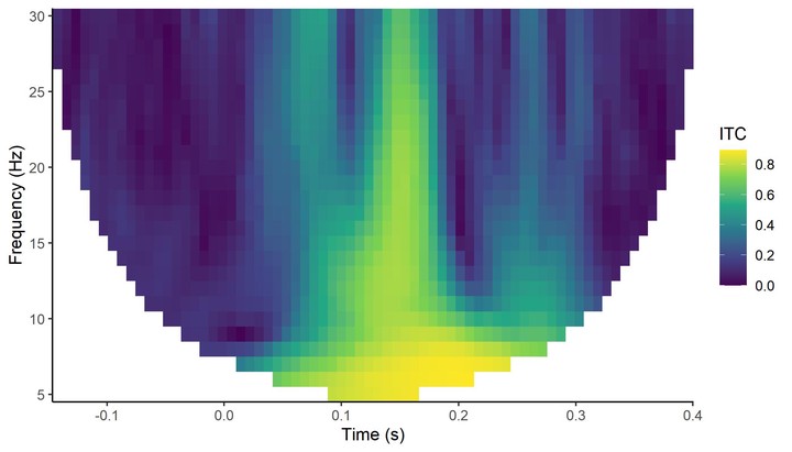 Intertrial coherence (ITC) is a measure of how consistent oscillatory phase is across an ensemble of trials.